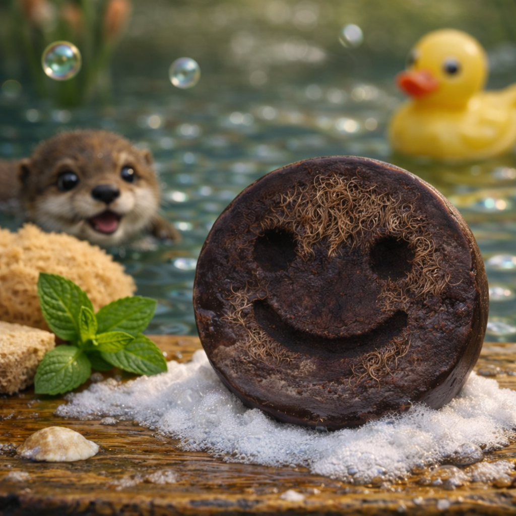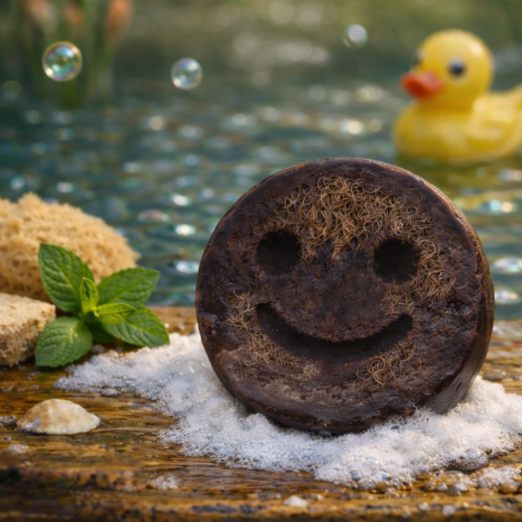 The friendly smiley design makes bath time feel like a small adventure, while the warm brown colour and soft coconut scent add a relaxing tropical touch. Inside the soap you will find natural loofah fibres from the luffa plant, known for their light scrubbing texture that many people enjoy during bath or shower time.