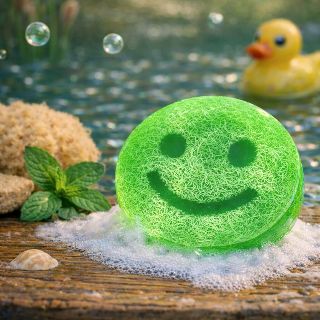 The friendly smiley design makes bath time feel like a small adventure, while the green colour and sweet mango scentadd an extra touch of fun. Inside the soap you will find natural loofah fibres from the luffa plant, known for their light scrubbing texture that many people enjoy during bath or shower time.
