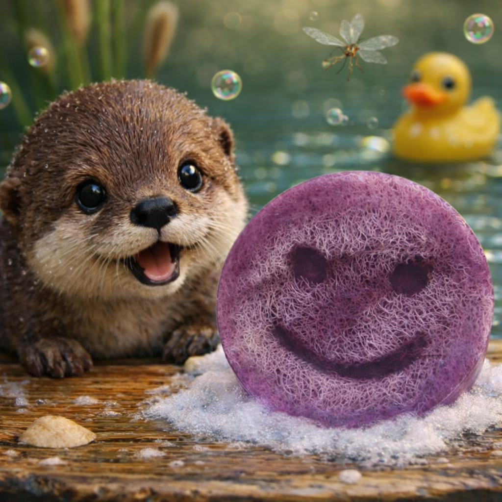 The friendly smiley design makes bath time feel like a small adventure, while the purple colour and sweet grape scentadd an extra touch of fun. Inside the soap you will find natural loofah fibres from the luffa plant, known for their light scrubbing texture that many people enjoy during bath or shower time.